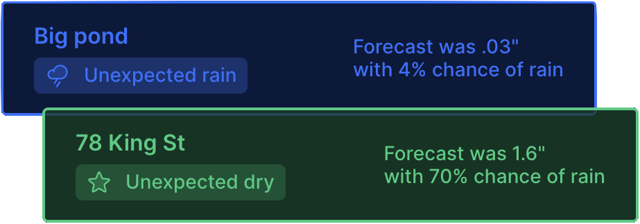 Get alerted when rain is observed at a location where it wasn't expected or when it doesn't rain when yesterday's forcast said it would.