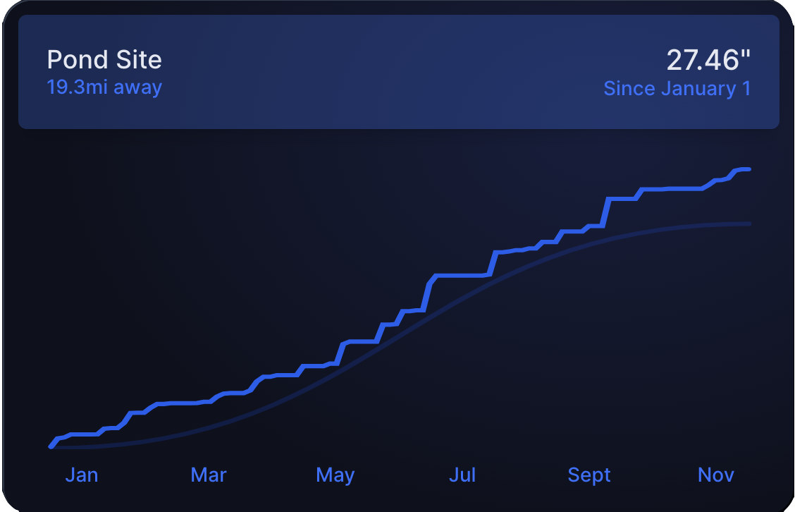 Monitor actual rainfall accumulation at any location without having to deploy weather stations or gauges. Get up to the hour rainfall estimates that automatically get more accurate over time.